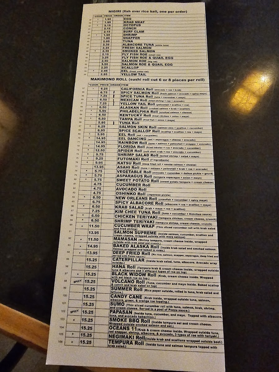 Fourteen pieces of sashimi(chefs choice) served with a California roll, one piece of chicken tempura, one piece of shrimp tempura, steamed rice or fried for an additional charge and a house soup and salad.